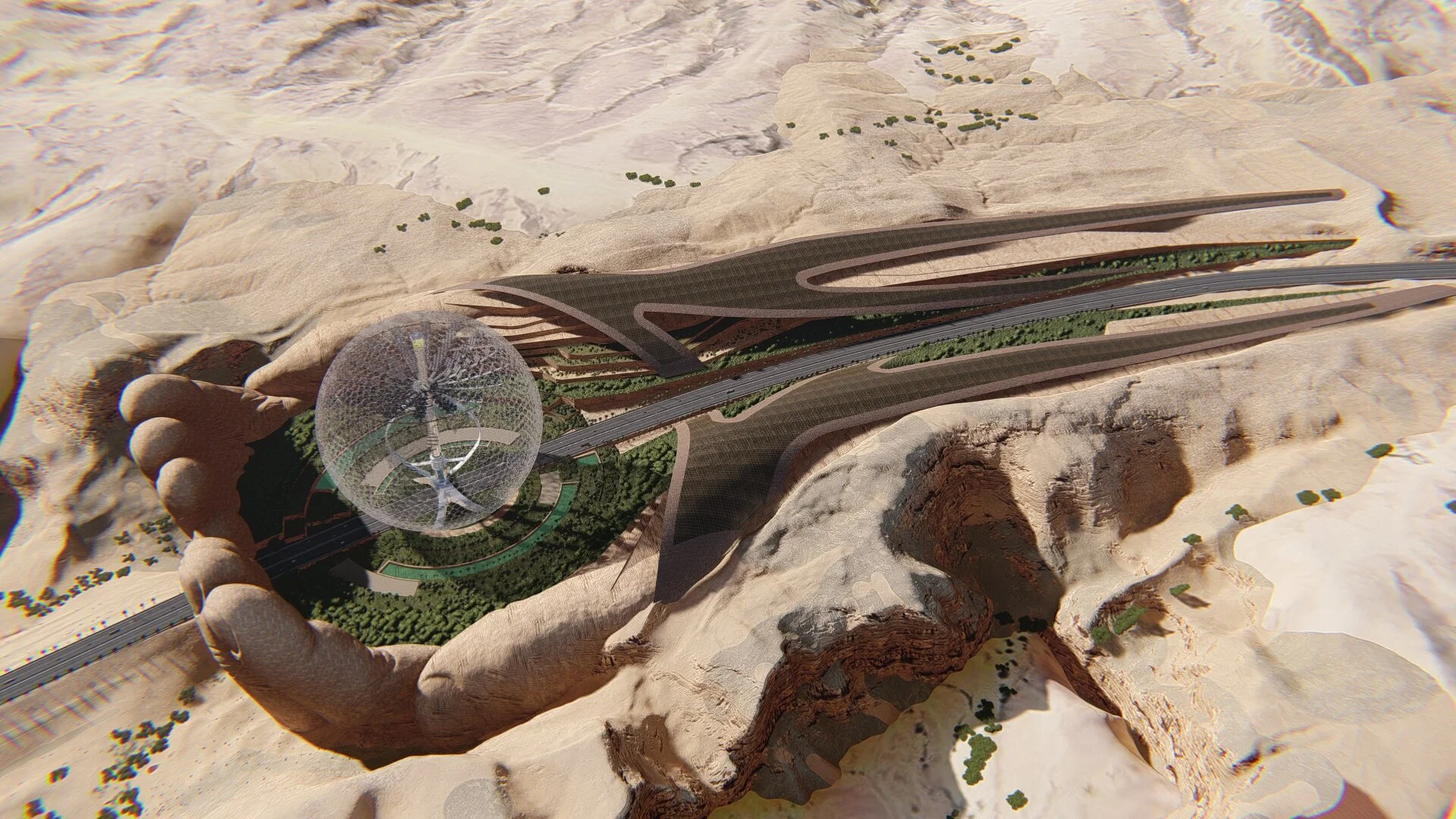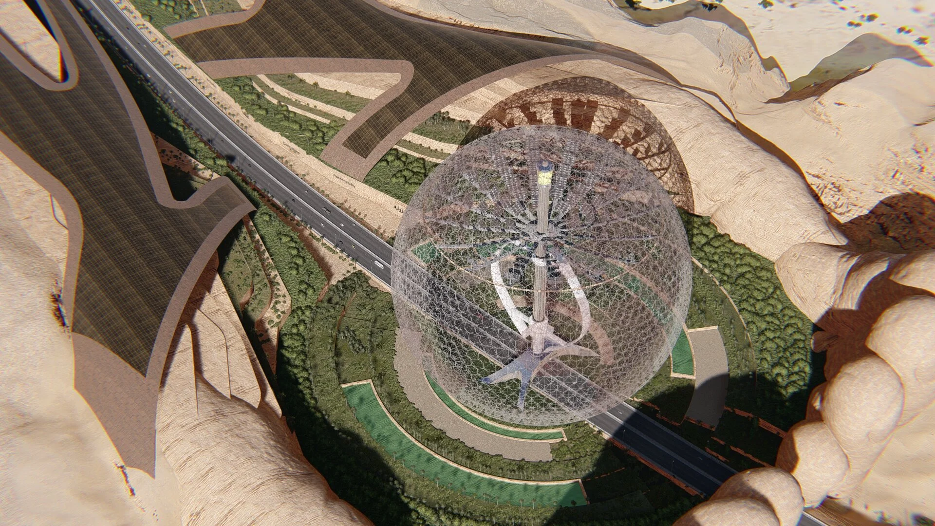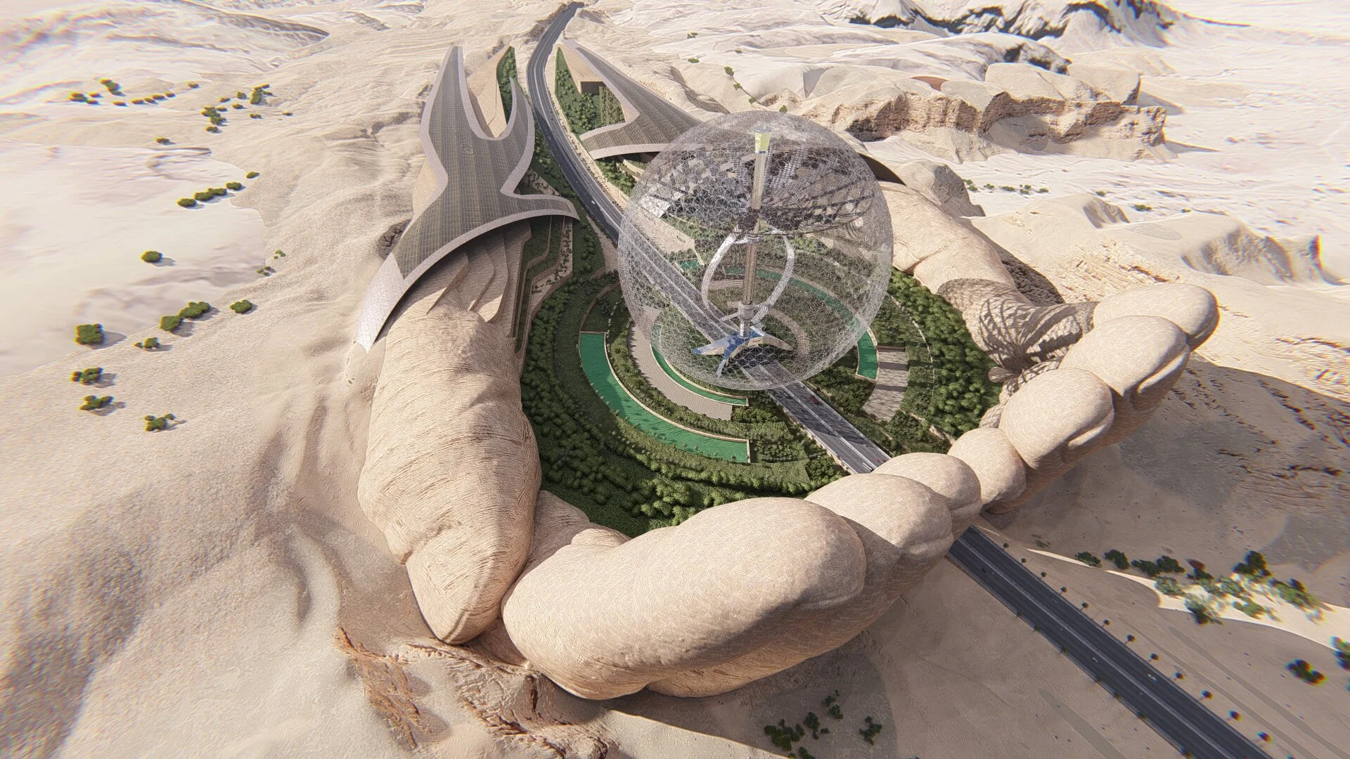 The carved hands will hold the largest energy sphere on the planet, representing the FOUR elements, which will Give back energy to the surrounding community, using solar energy, wind energy, geothermal energy and hydro accumulation, as a symbol of Saudia Arabia's secular herritage with a firm view towards its properous sustainable future. The metallic skin covering the forearms is made out of corten steel and partly covered by Solar panels.